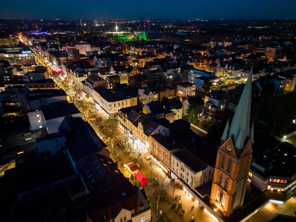 Der Herner Weihnachtsmarkt 2025 auf der Bahnhofstraße aus der Luft gesehen (Foto: © Stadtmarketing Herne GmbH, Hanjo Schumacher).